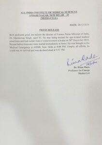 वही एम्स नई दिल्ली ने मनमोहन के निधन की पुष्टि करते हुए न्यूज बुलेटिन जारी किया है। एम्स ने कहा, “अत्यंत दुःख के साथ हम भारत के पूर्व प्रधानमंत्री डॉ. मनमोहन सिंह के निधन की सूचना देते हैं। उन्होंने 92 वर्ष की उम्र में अंतिम सांस ली। वे उम्र से संबंधित बीमारियों के कारण उपचाराधीन थे और 26 दिसंबर 2024 को घर पर अचानक बेहोश हो गए थे। घर पर ही उन्हें तुरंत पुनर्जीवित करने के उपाय शुरू किए गए। उन्हें रात 8:06 बजे एम्स, नई दिल्ली के मेडिकल इमरजेंसी में लाया गया। तमाम कोशिशों के बावजूद उन्हें बचाया नहीं जा सका और रात 9:51 बजे उन्हें मृत घोषित कर दिया गया।”