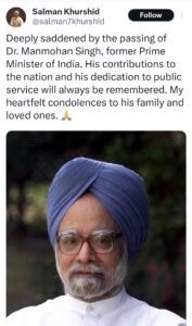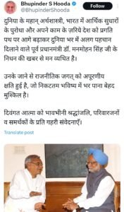 वही इससे पहले कांग्रेस पार्टी के कई वरिष्ठ नेताओं ने इस खबर की पुष्टि की। पूर्व केंद्रीय मंत्री सलमान खुर्शीद, हरियाणा के पूर्व सीएम भूपेंद्र सिंह हुड्डा ने मनमोहन सिंह के निधन पर श्रद्धांजलि दी। डॉ. मनमोहन सिंह अपनी सरलता, ईमानदारी और उत्कृष्ट आर्थिक नीतियों के लिए जाने जाते थे। उनका निधन भारतीय राजनीति और अर्थव्यवस्था के लिए एक अपूरणीय क्षति है। उनका अंतिम संस्कार पूरे राजकीय सम्मान के साथ किया जाएगा।