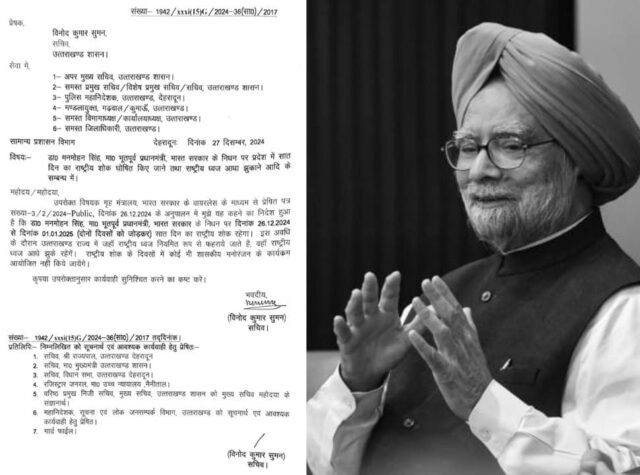 उत्तराखंड शासन ने 7 दिन का राष्ट्रीय शोक का आदेश जारी किया है, पूर्व प्रधानमंत्री स्व. मनमोहन सिंह के निधन पर यह फैसला लिया है. बता दें कि उत्तराखंड शासन के सचिव विनोद कुमार सुमन की ओर से आदेश जारी किया गया है। आदेश के तहत पूर्व प्रधानमंत्री स्व. मनमोहन सिंह के निधन के चलते राज्य में सात दिनों का राष्ट्रीय शोक रखने का आदेश जारी किया गया है। आदेश के तहत सात दिनों तक राष्ट्रीय ध्वज आधा झूका रहेगा। इसके साथ ही आदेश में कहा गया है कि राष्ट्रीय शोक के दिनों में कोई भी शासकीय मनोरंजन के कार्यक्रम आयोजित नहीं किये जाएंगे।