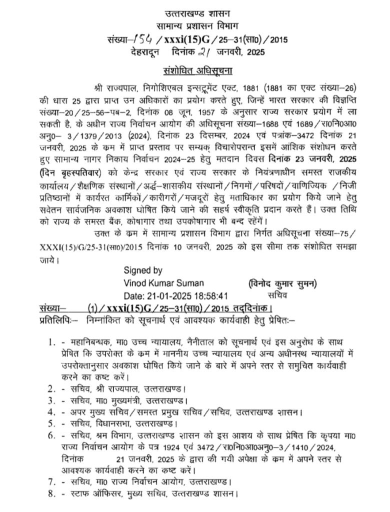 मतदान दिवस यानी 23 जनवरी को सार्वजनिक अवकाश को लेकर 21 जनवरी को संशोधित आदेश जारी कर दिया गया है. जारी किए गए आदेश के अनुसार, राज्यपाल ने निगोशिएबल इंस्ट्रूमेंट एक्ट, 1881 (1881 का एक्ट संख्या-26) की धारा 25 में दिए गए अधिकारों का प्रयोग करते हुए, राज्य में मौजूद सभी केंद्रीय और राजकीय कार्यालय /शैक्षणिक संस्थानों /अर्द्ध-निकायों /वाणिज्यिक /निजी प्रतिष्ठानों में अवकाश रहेगा. इसके साथ ही राज्य में मौजूद सभी बैंक कोषागार और उपकोषागार भी बंद रहेंगे. लिहाजा, इनमें काम करने वाले सभी कर्मचारियों के मतदान दिवस 23 जनवरी 2025 को सवेतन सार्वजनिक अवकाश को मंजूरी दी है।