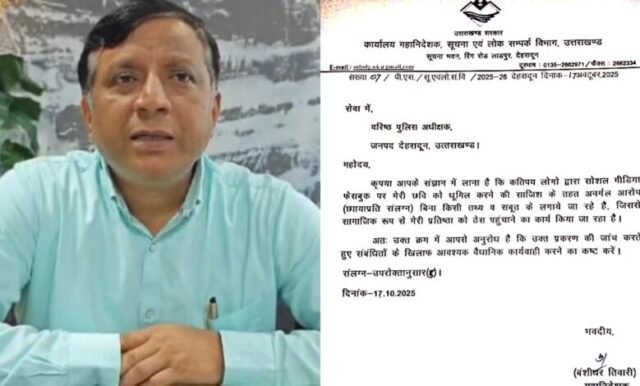 देहरादून। सूचना विभाग के महानिदेशक बंशीधर तिवारी ने वरिष्ठ पुलिस अधीक्षक को दी एक तहरीर में कहा है कि आपके संज्ञान में लाना है कि कतिपय लोगो द्वारा सोशल मीडिया फेसबुक पर मेरी छवि को धूमिल करने की साजिश के तहत्त अनर्गल आरोप (छायाप्रति संलग्न) बिना किसी तथ्य व सबूत के लगाये जा रहे है, जिससे सामाजिक रूप से मेरी प्रतिष्ठा को ठेस पहुंचाने का कार्य किया जा रहा है।
